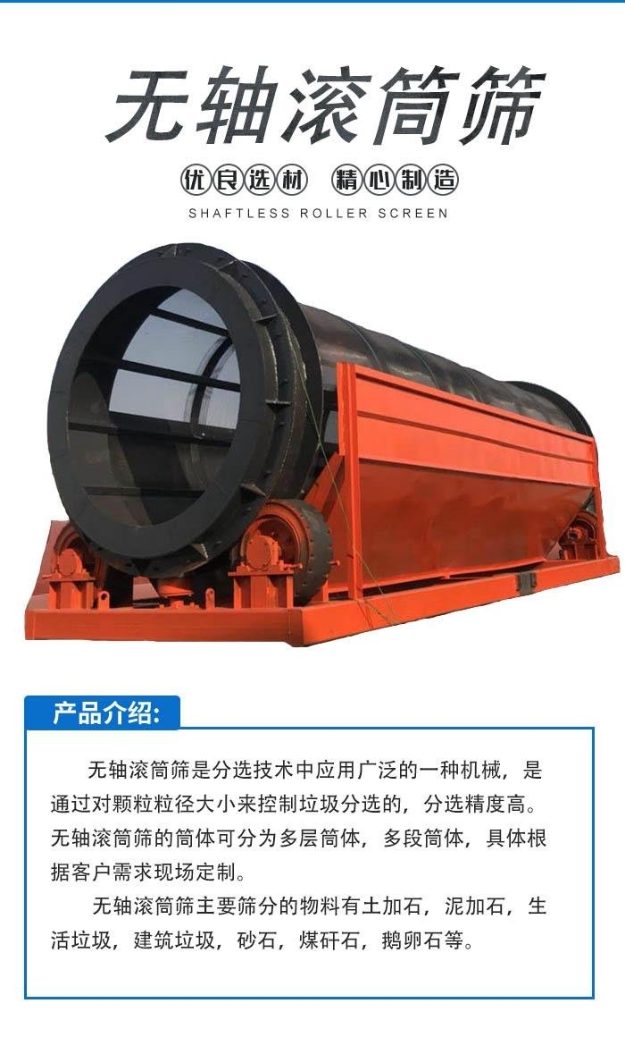 無(wú)軸滾筒篩分機(jī)適宜篩分石料、砂子、各種性質(zhì)的垃圾、及潮濕易堵塞物料,篩下產(chǎn)品200mm,中間20-40mm,細(xì)可達(dá)5mm以下,帶自清理裝置,傳動(dòng)方式分為:大小齒輪傳動(dòng)、鏈輪鏈條傳動(dòng)、托輥摩擦傳動(dòng)三種,有各種篩網(wǎng)如:錳絲編織網(wǎng)、鋼板沖孔網(wǎng)、鋼筋焊接網(wǎng)、不銹鋼篩網(wǎng)等可供客戶選擇。特殊情況可專門制定。無(wú)軸滾筒篩分機(jī)是垃圾處理線中的重要篩分設(shè)備。